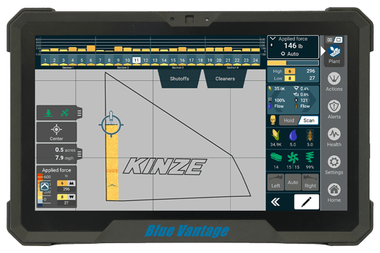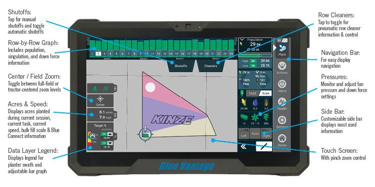 The designed-by-Kinze and built-for-Kinze Blue Vantage display is the industry’s easiest to use, dedicated planter display that eliminates the entering of endless information and the pressing numerous confirmations just to start planting. The innovative, clean, and streamlined display provides simple, accurate, and intuitive planter control for high productivity planting. Factory presets remove the labor and guesswork from setup, while a dedicated planting screen provides all critical information at one glance during planting. With system diagnostics built-in, trouble shooting is simplified for optimum efficiency.